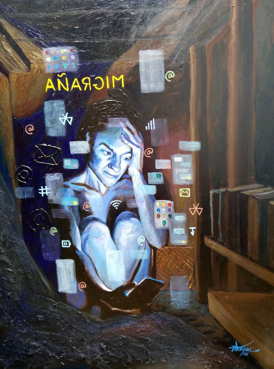 Después me asediará un dolor intenso en la mitad de la cabeza, como si miles de martillos de acero golpearan mi cráneo. Me doparé con infinidad de cápsulas antiinflamatorias. Apagaré la luz y cerraré las ventanas. No me he atrevido a consultar con un médico. En internet encuentro toda la información que necesito. En absoluto silencio, en una habitación oscura, encontraré la calma a esta tortura. Y el teléfono me ayudará a sentirme mejor, facilitándome recetas curativas. Siempre intentarán convencerme de que es mi uso desmedido del móvil el origen de estas migrañas. No voy a ceder en esto. El teléfono es el único que parece dispuesto a echarme una mano.